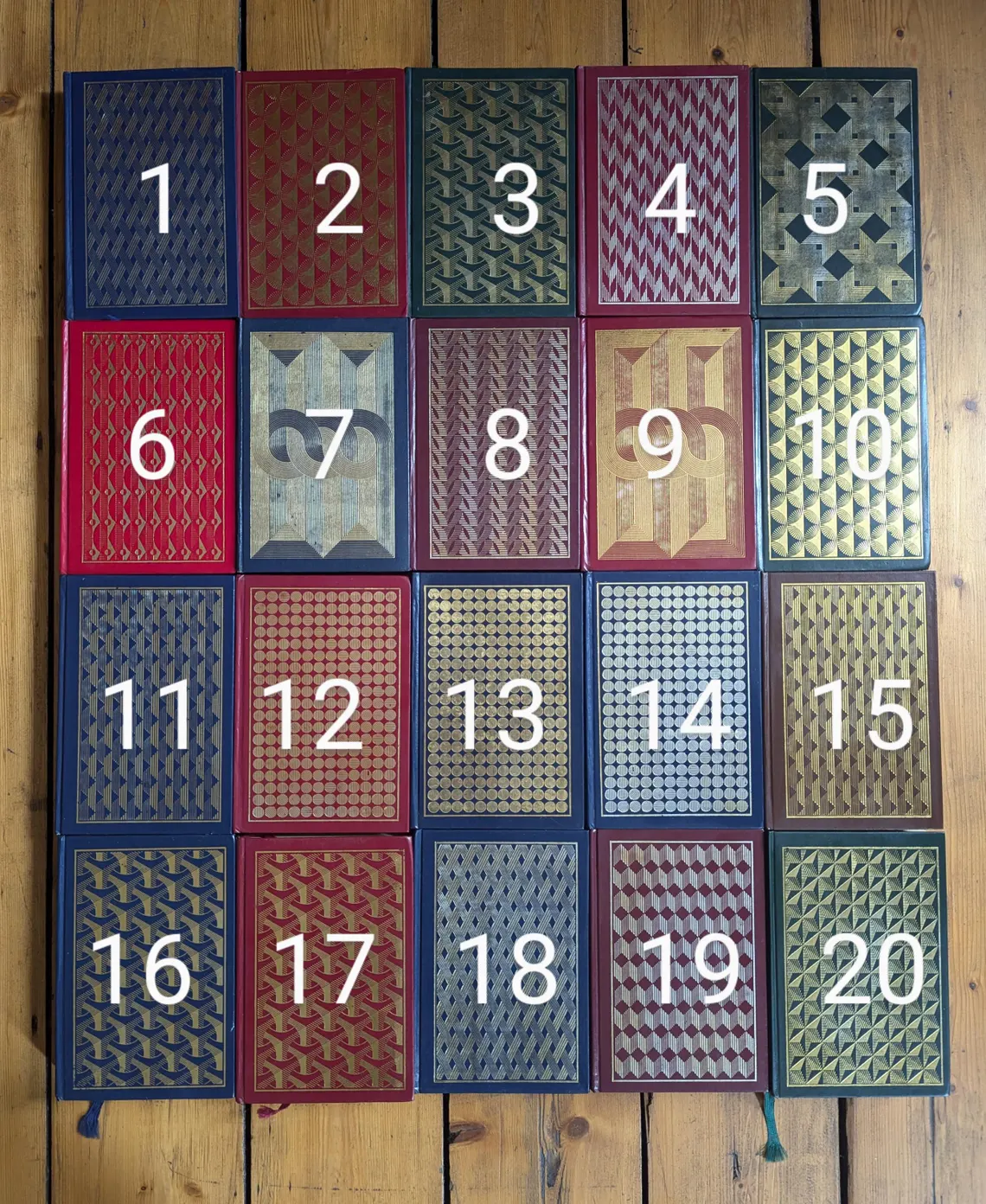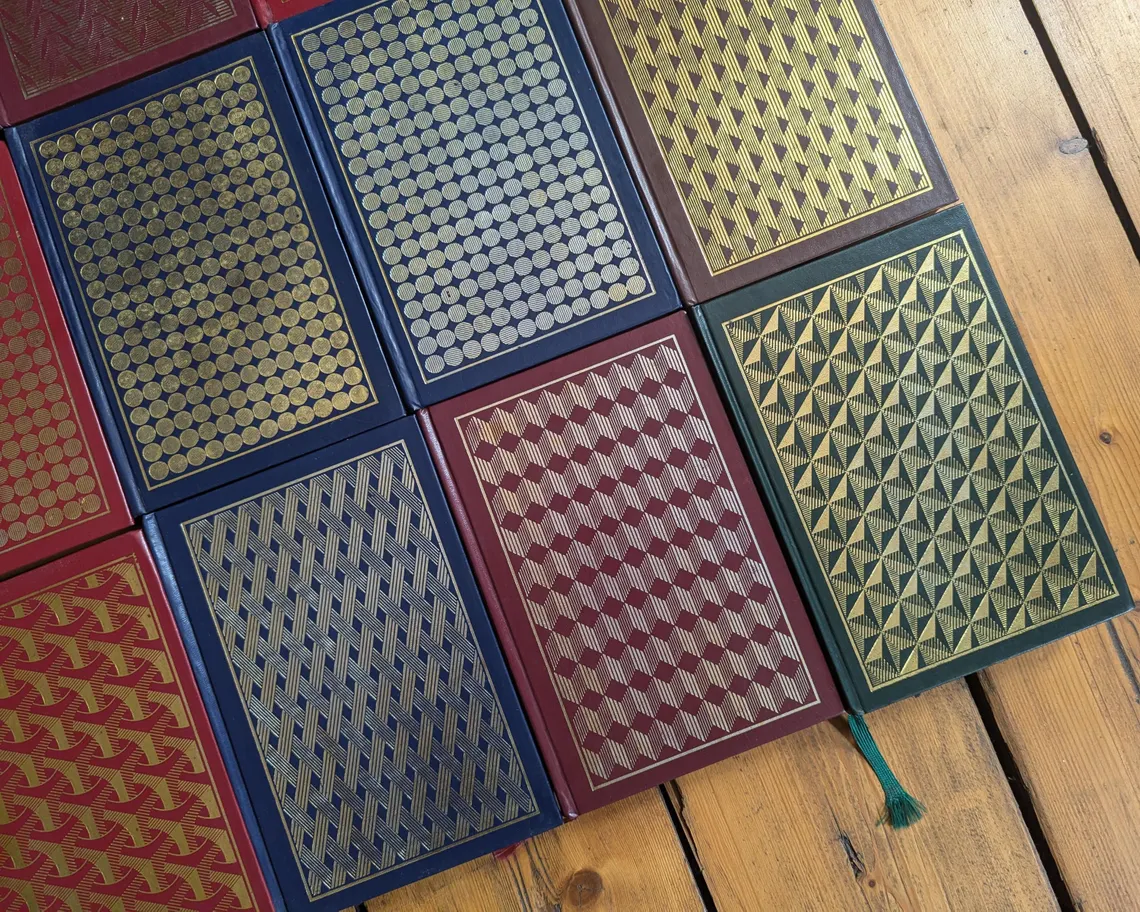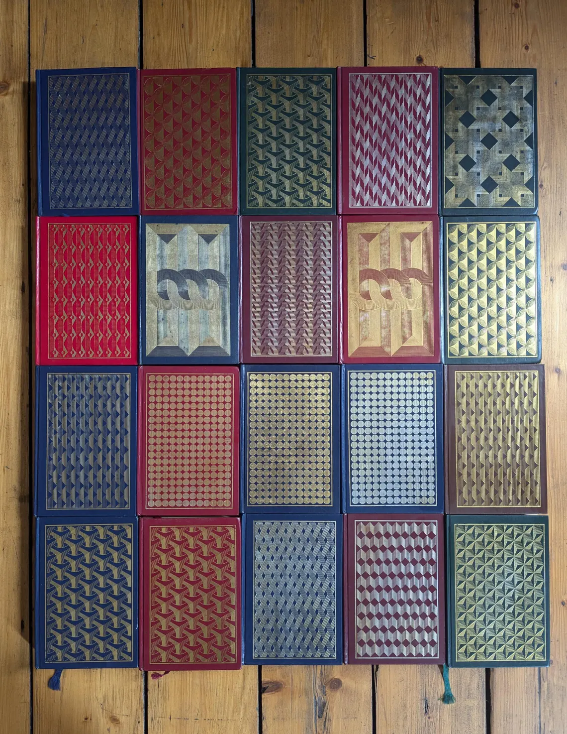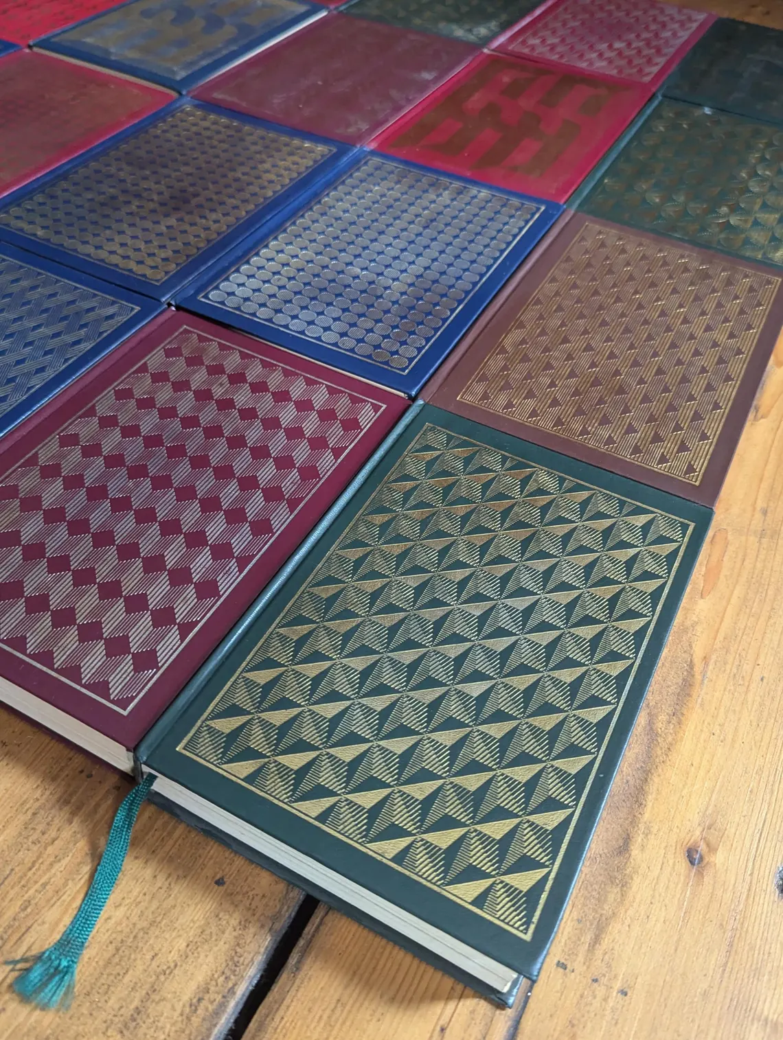 With fantastic hardcovers and very attractive and decorative geometric gilt embossed patterns.
