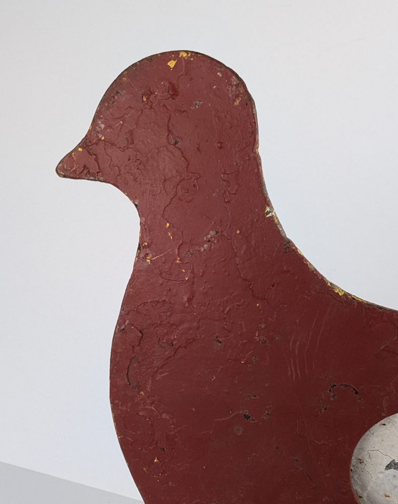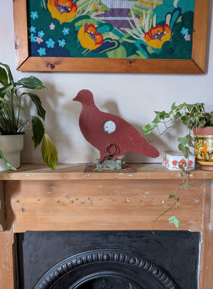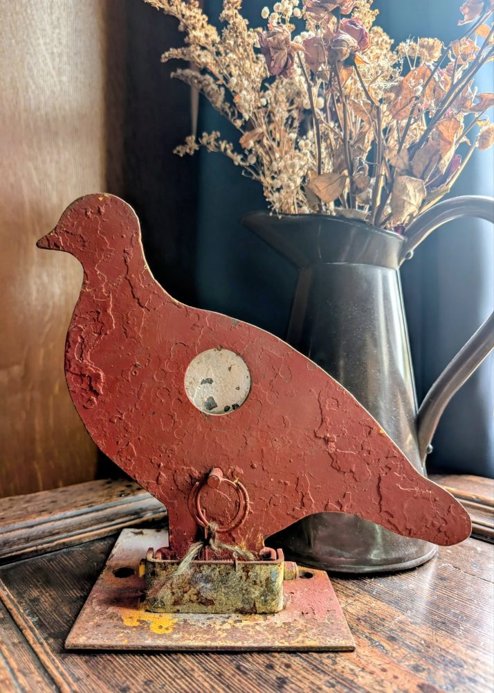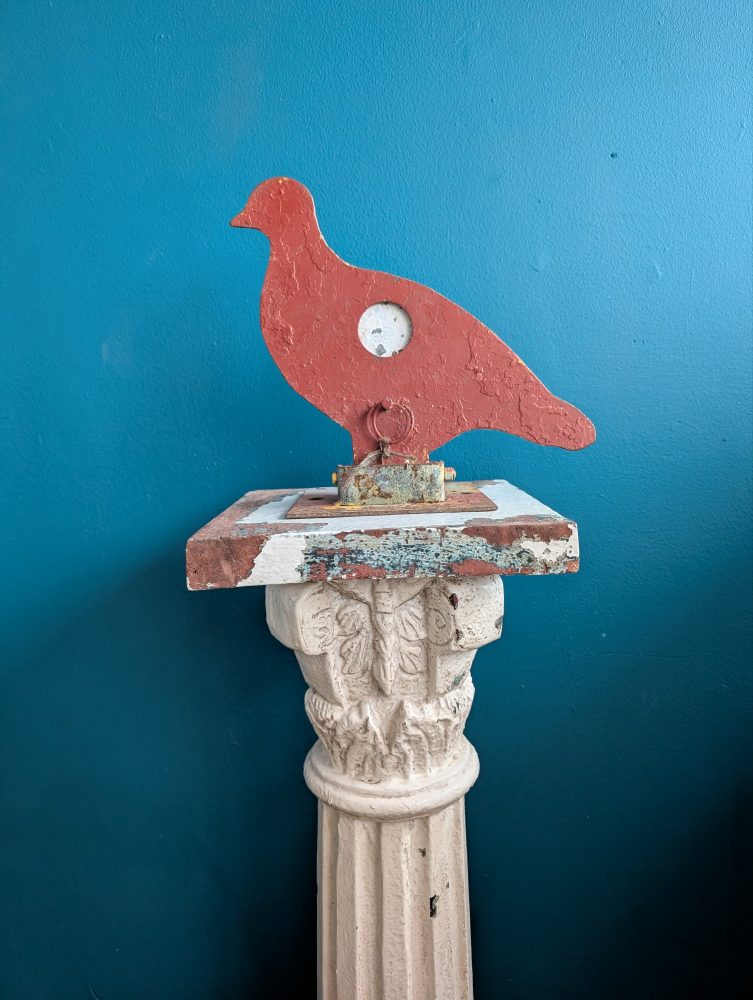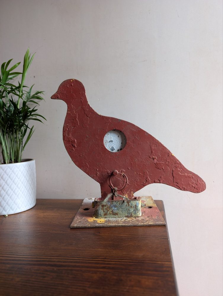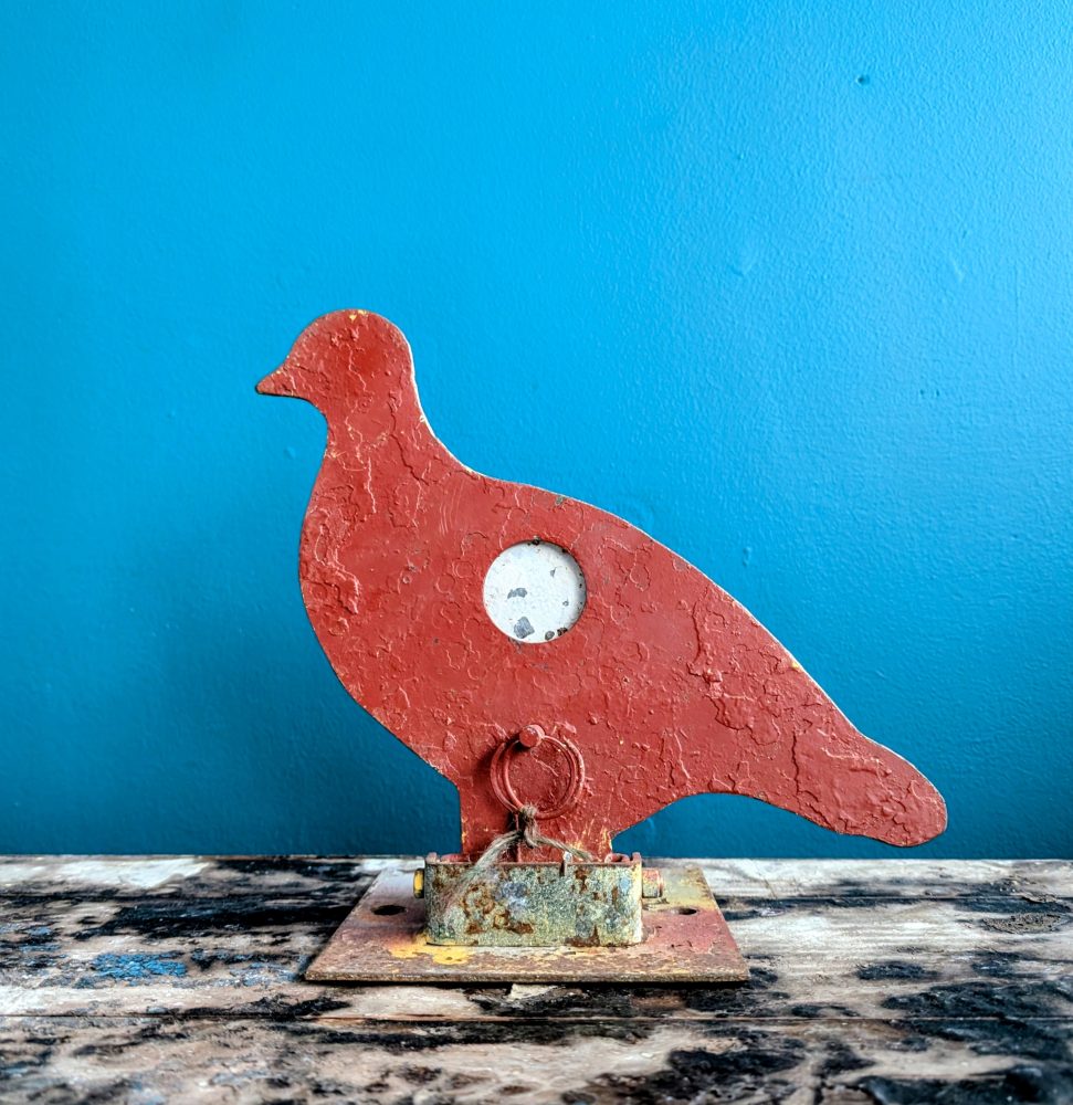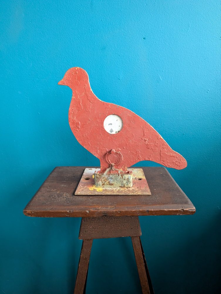 A rare piece of a genuine fairground attraction, from a firing range where this poor red pigeon would have stood in a row with others, hoping not to be shot in the chest, at which point the bird will fall back.