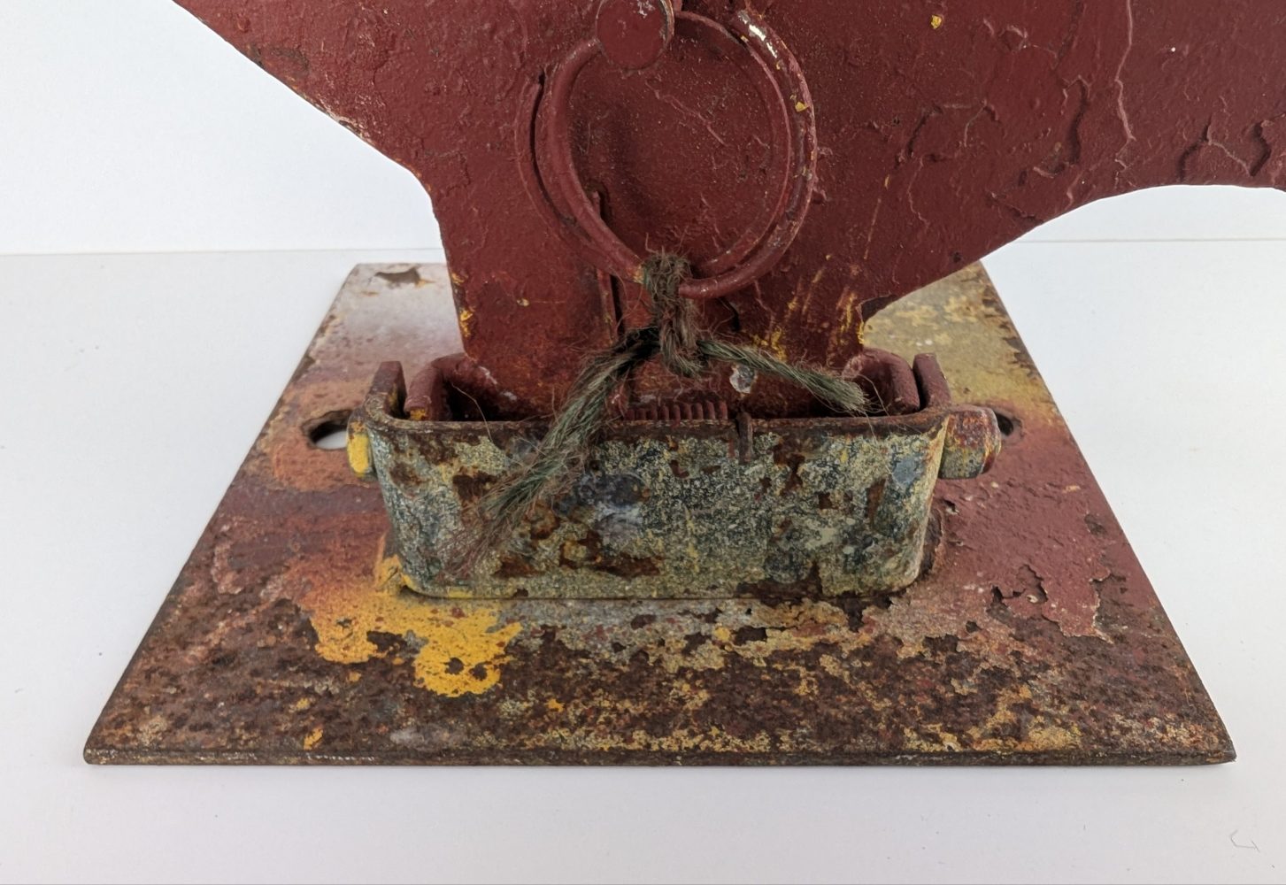 Held down through the two screw holes in its base, this old bird still flips down and can be pulled back up again.