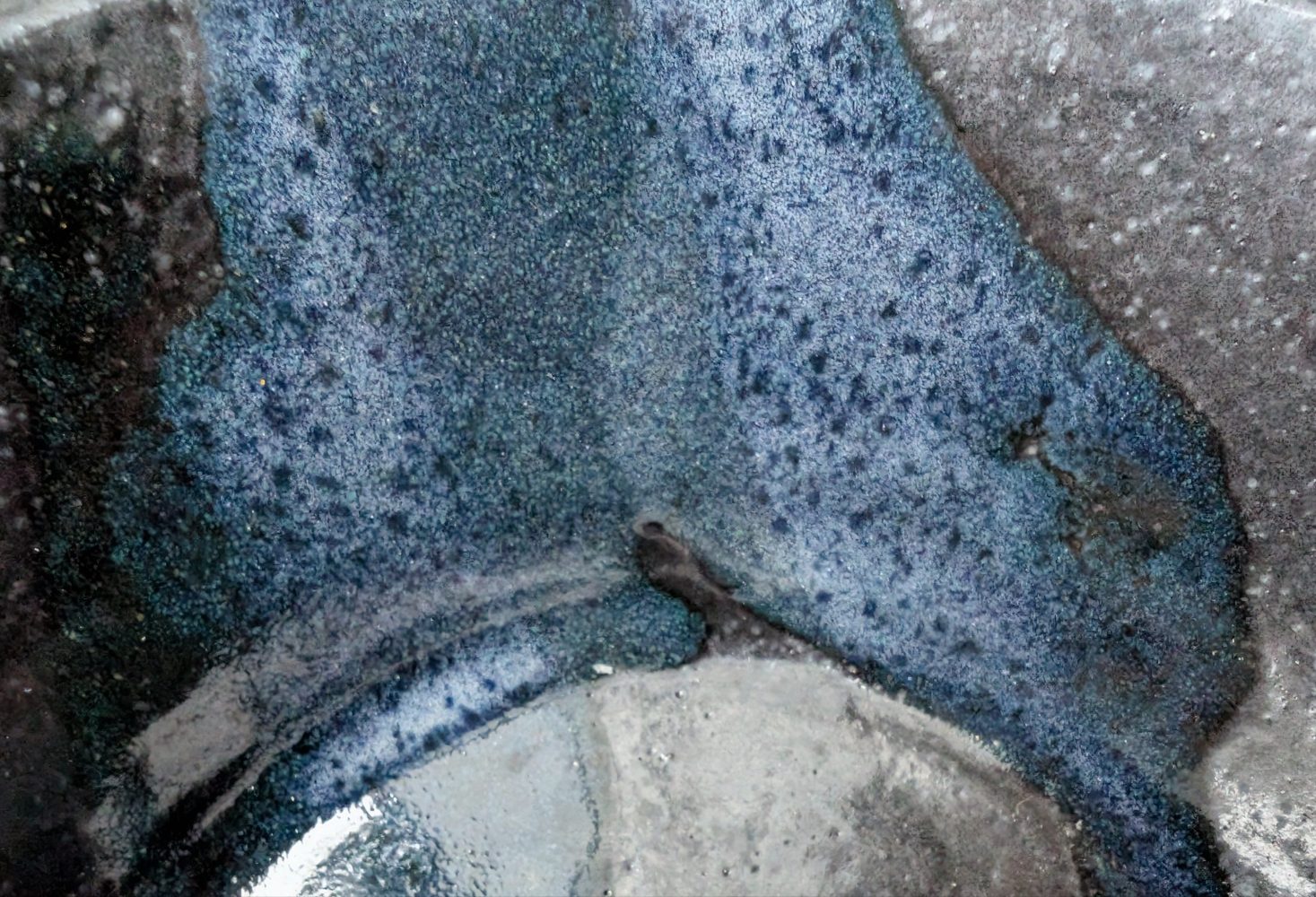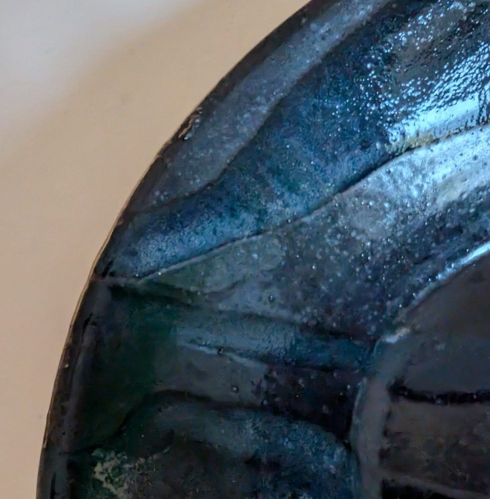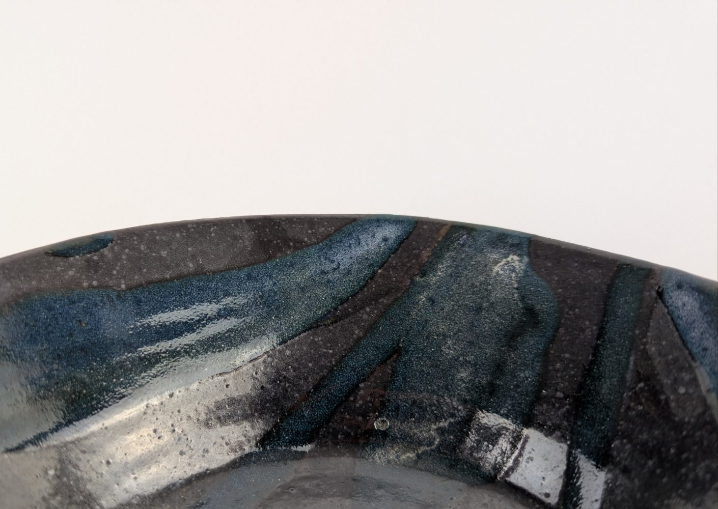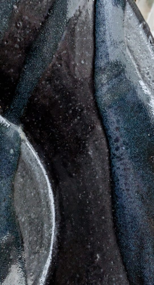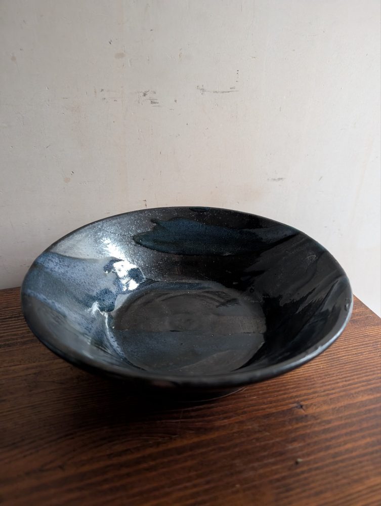 A unique handmade piece with a black base and blue lava like patterns.