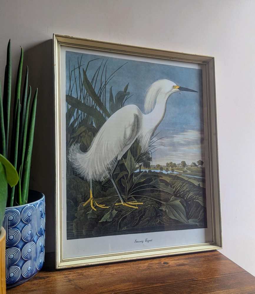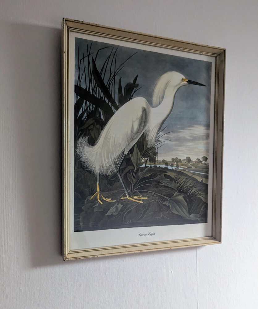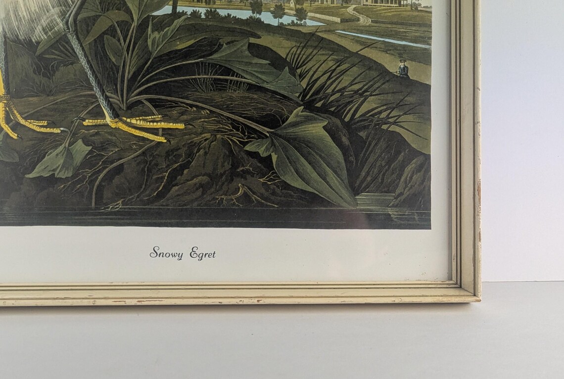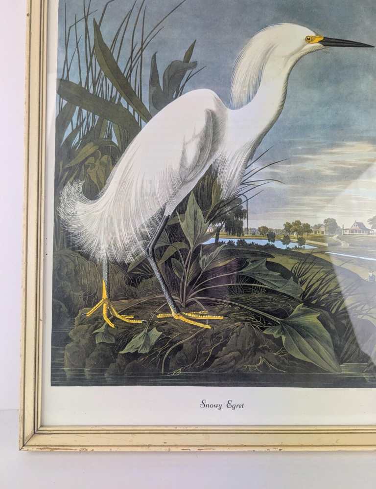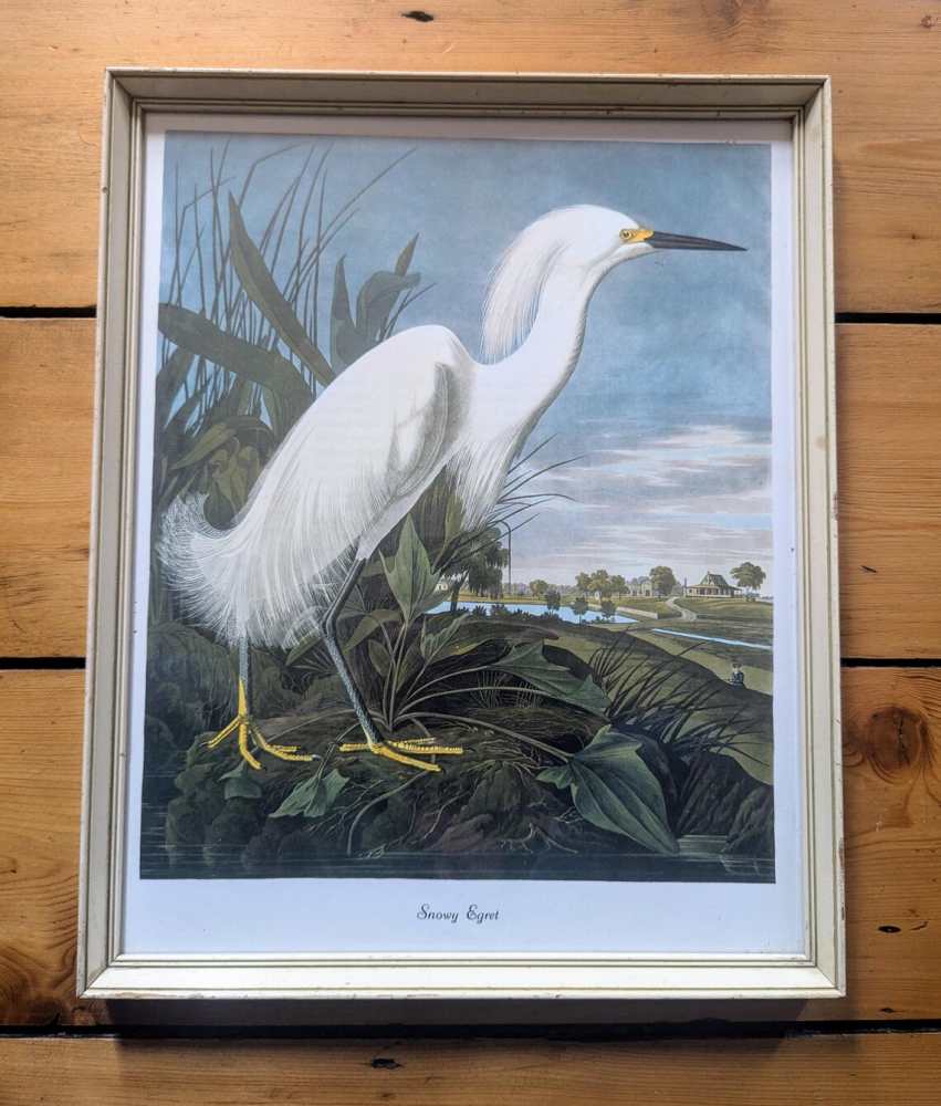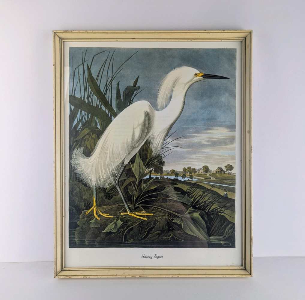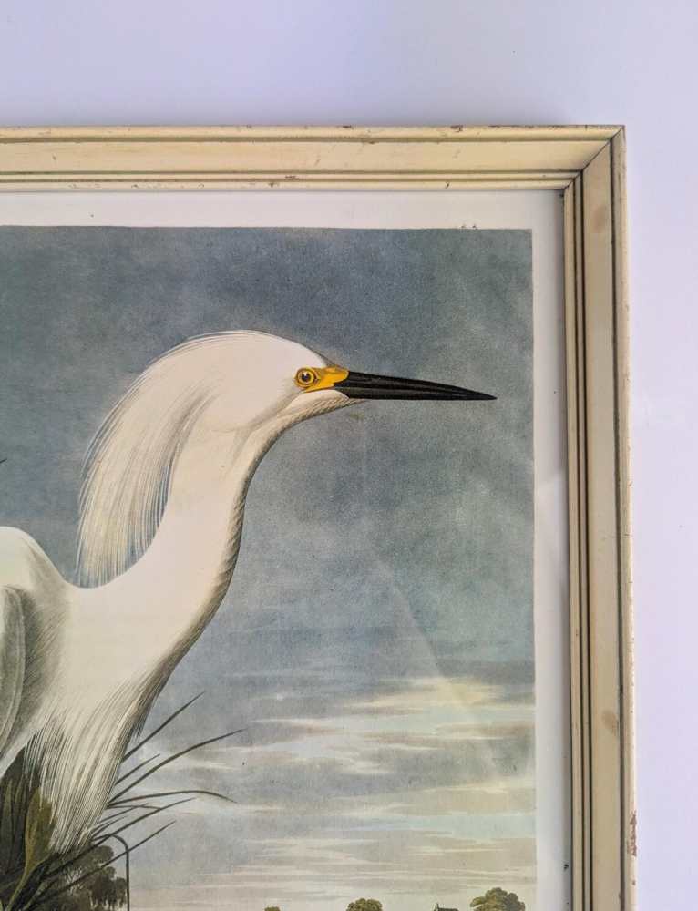 Vintage Snowy Egret print in white vintage frame, after J.J. Audubon’s early 19th century bird illustrations