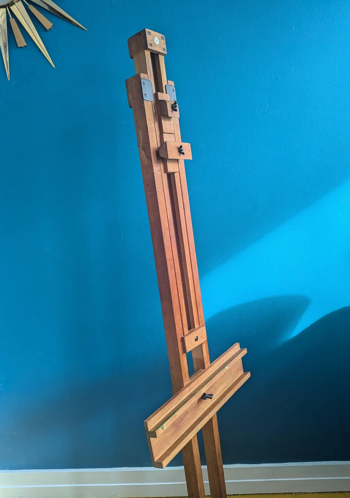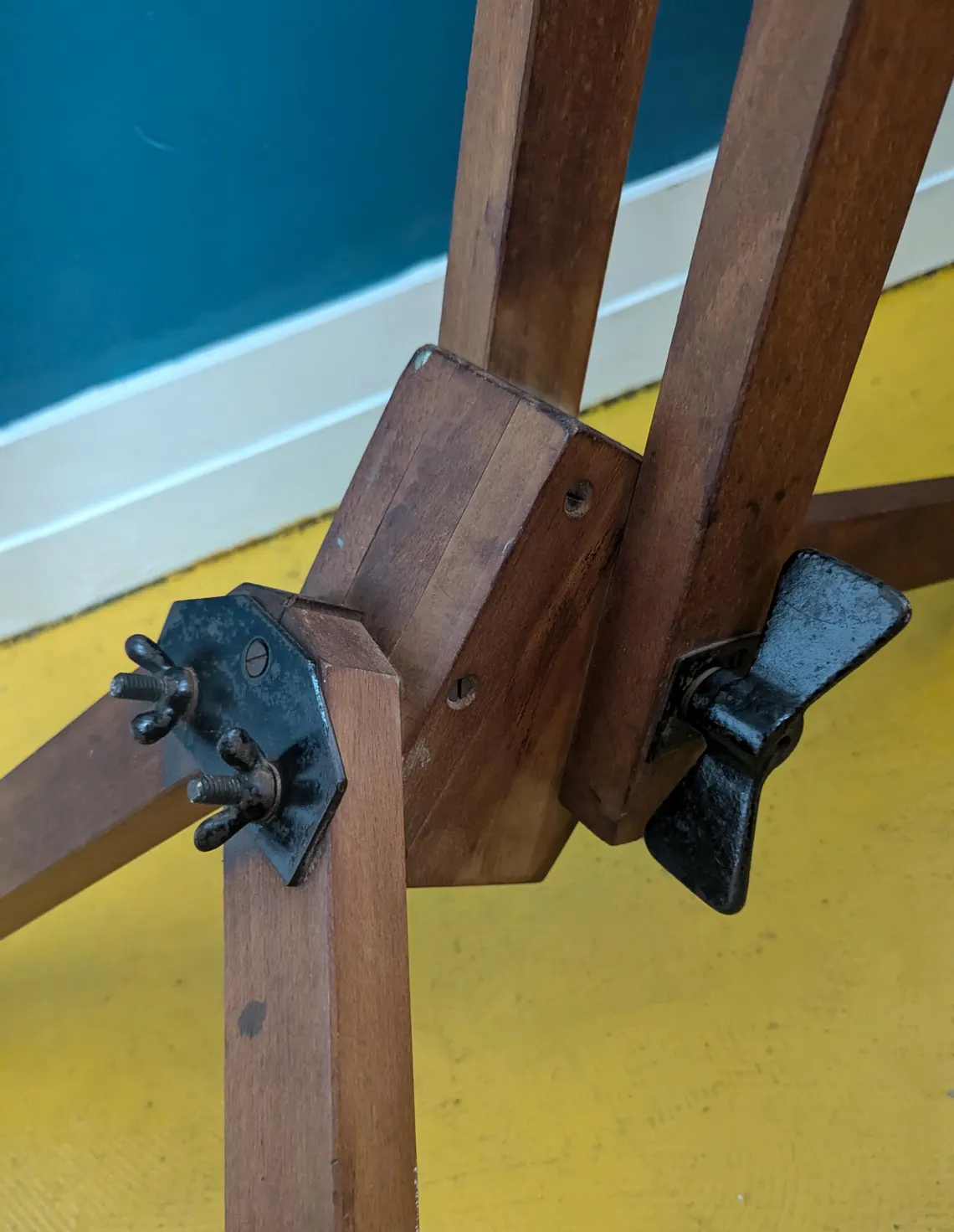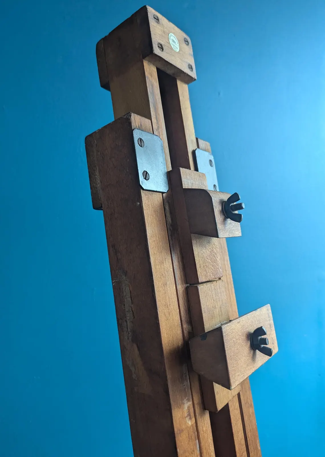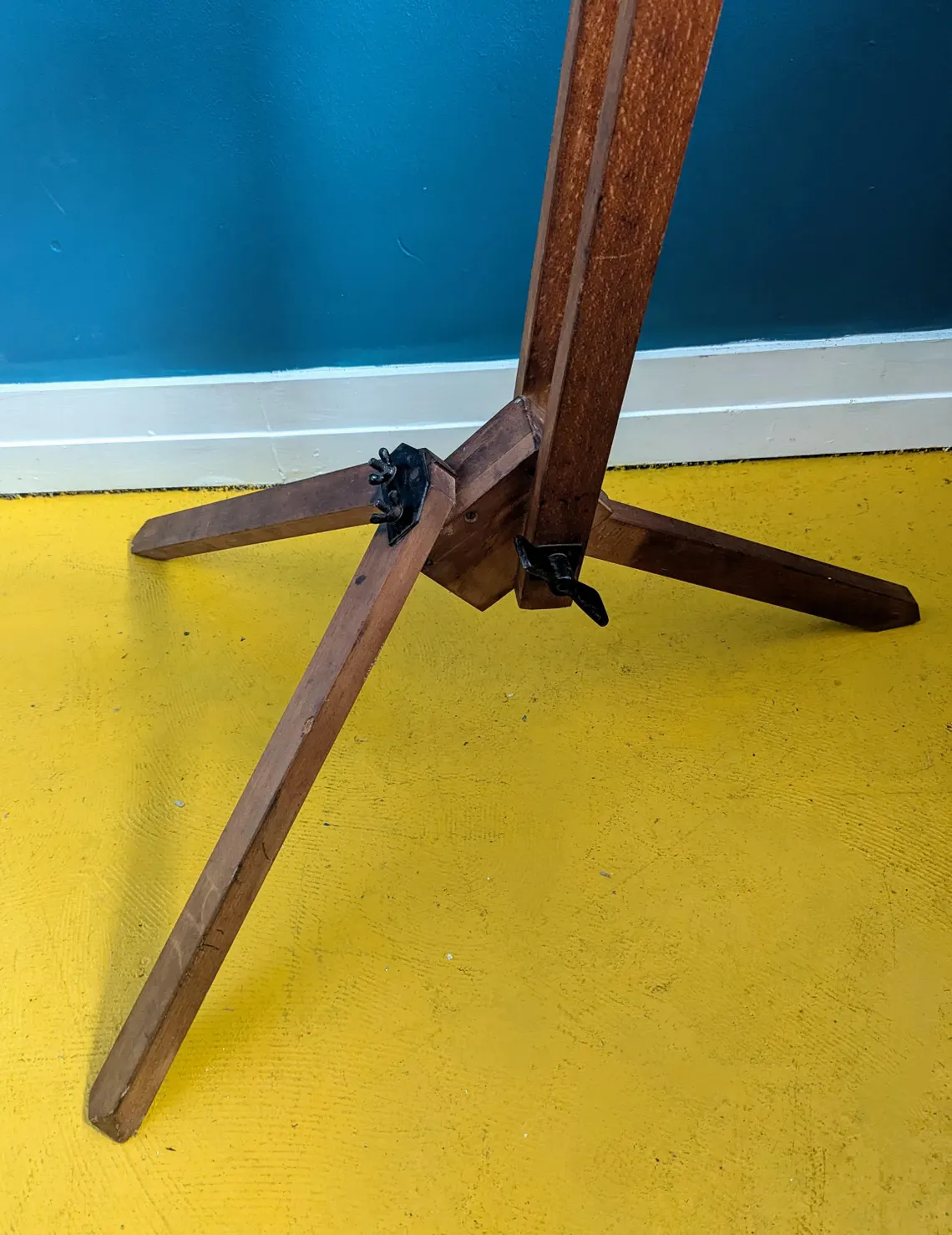 Adjustable to fit a range of picture sizes, the height of the easel ranging from 175cm – 244cm depending on the angle of the legs and height of the upright. The front of the base measures 73cm wide. The angle of the easel is adjusted by a large bow tie shaped screw.