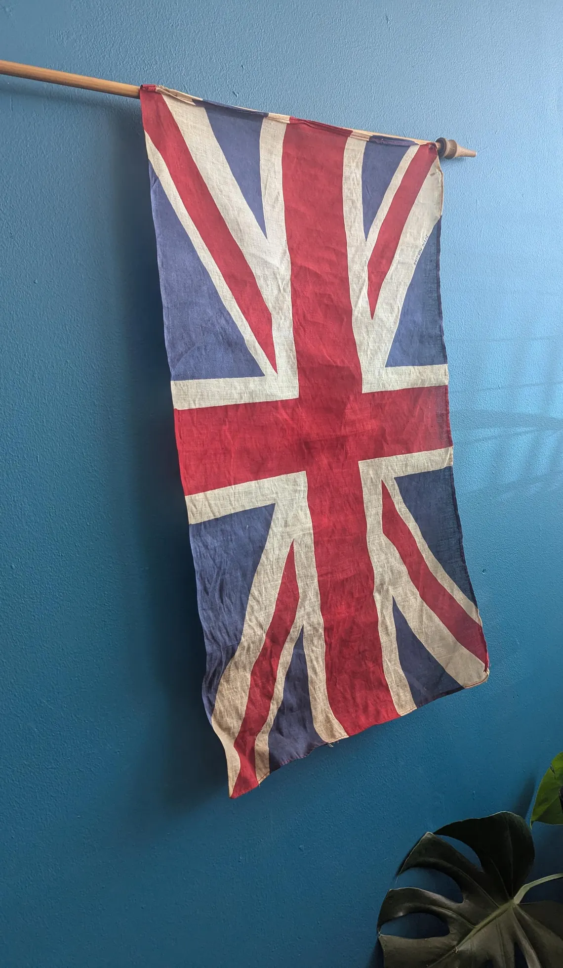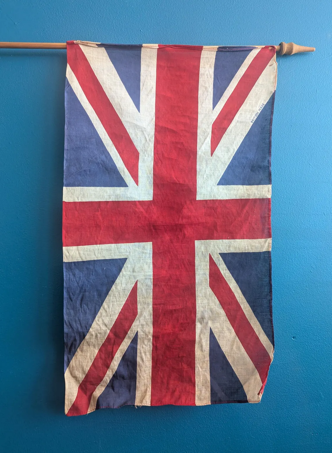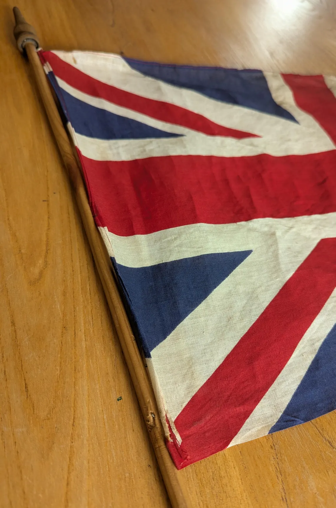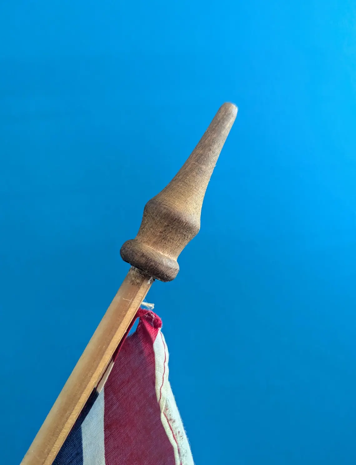 A vintage WWII period Union Jack flag in cotton on a wooden pole with tapering finial.